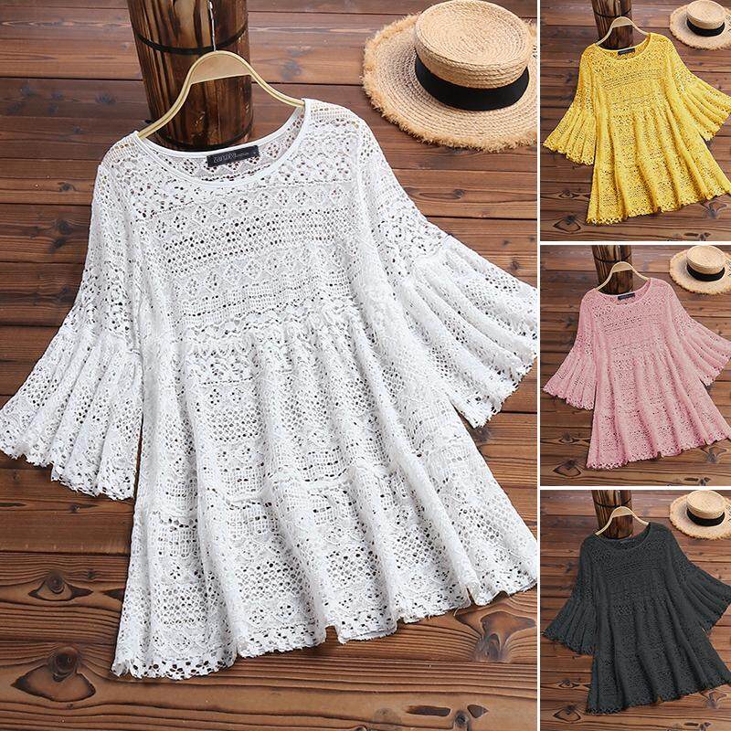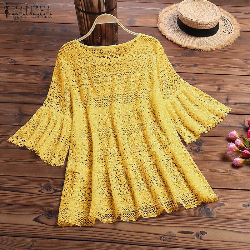 ZANZEA Women Bell Sleeve Shirt Tops Lace Detail Hollow Out Tops Loose Crochet Blouse