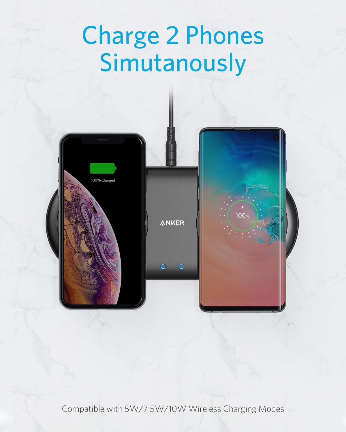 Anker PowerWave 10 Dual wireless charging Pad, Qi Certified 7.5W Compatible iPhone XS Max/XR/XS/X/8/8 Plus, 10W Charges Galaxy S10/S10+/S9/S9+/S8/S8+/Note 8, and 5W Charges All Qi-Enabled Phones, DC A