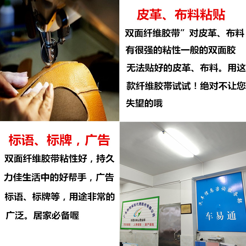 double-wire chemical fiber double-sided adhesive tape has high bonding strength for various pasted objects, and is combined with automobile industry, foam, textile, non-woven fabric, leather and so on.