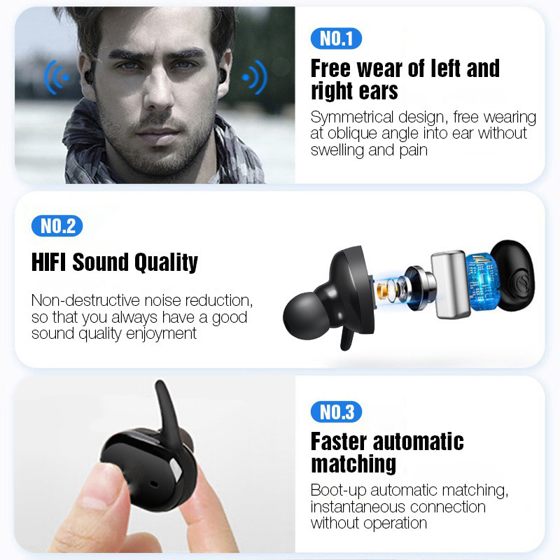 1). Automatic Pair, Automatic Power On/Off: when take out the headsets from charger box, the two headsets will turn on automatically and pair with each other automatically. when put back the headset to charger box, it will turn off automatically.