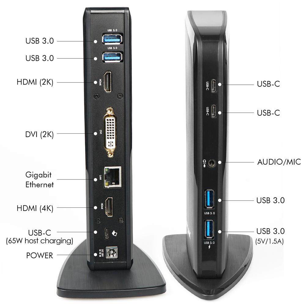 A single USB C port from your laptop expands to 13ports. USB C docking station offers up to 65 watts of power delivery and enables additional triple display, gigabit Intel Ethernet, audio input/output, 6 xUSB 3.0 (5Gbps) expansion.