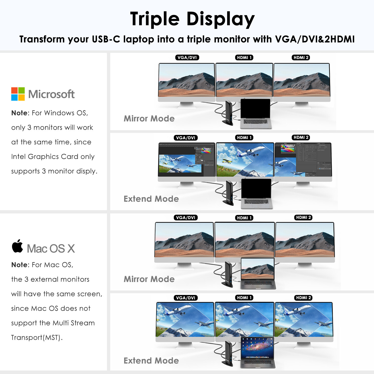 You can easily connect your two HDMI monitors and one DVI monitor. Two additional video outputs (1x HDMI & 1x DVI/VGA) via DisplayLink DL-3900, One of HDMI via USB C Vesa Alt. Mode up to 3840x2160 4K@30Hz resolution, DisplayLink HDMI and DVI outputs support 1080P@60Hz