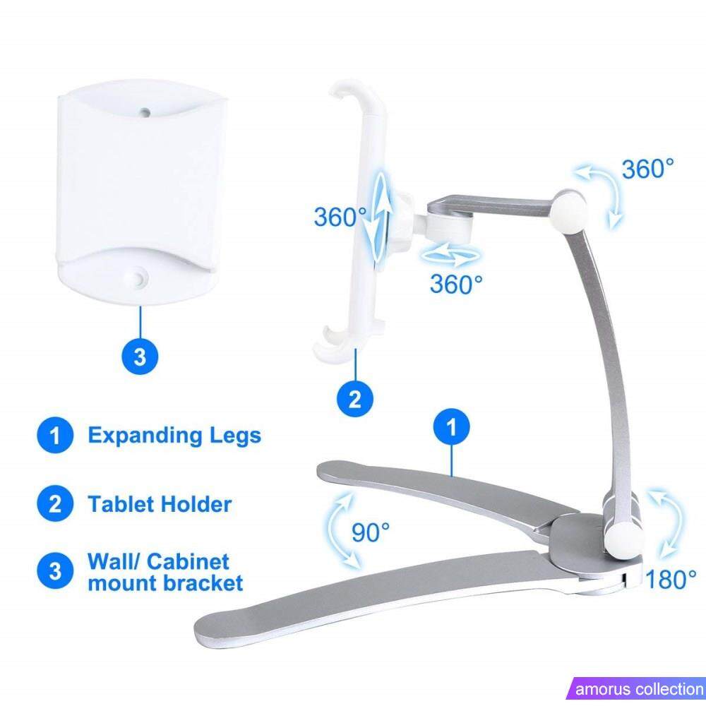 Easily installs on a wall or under a cabinet or stands upright with its expanding legs on any tabletop or counter surface