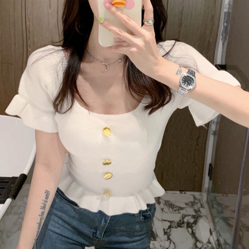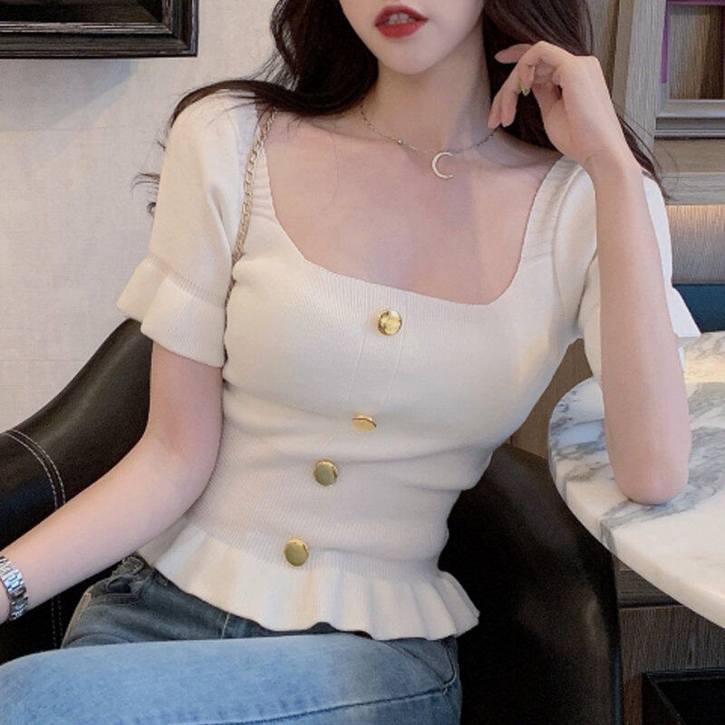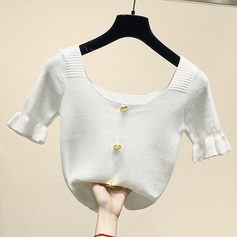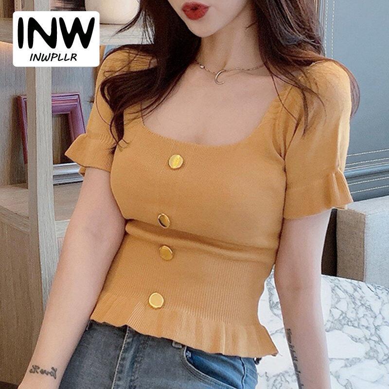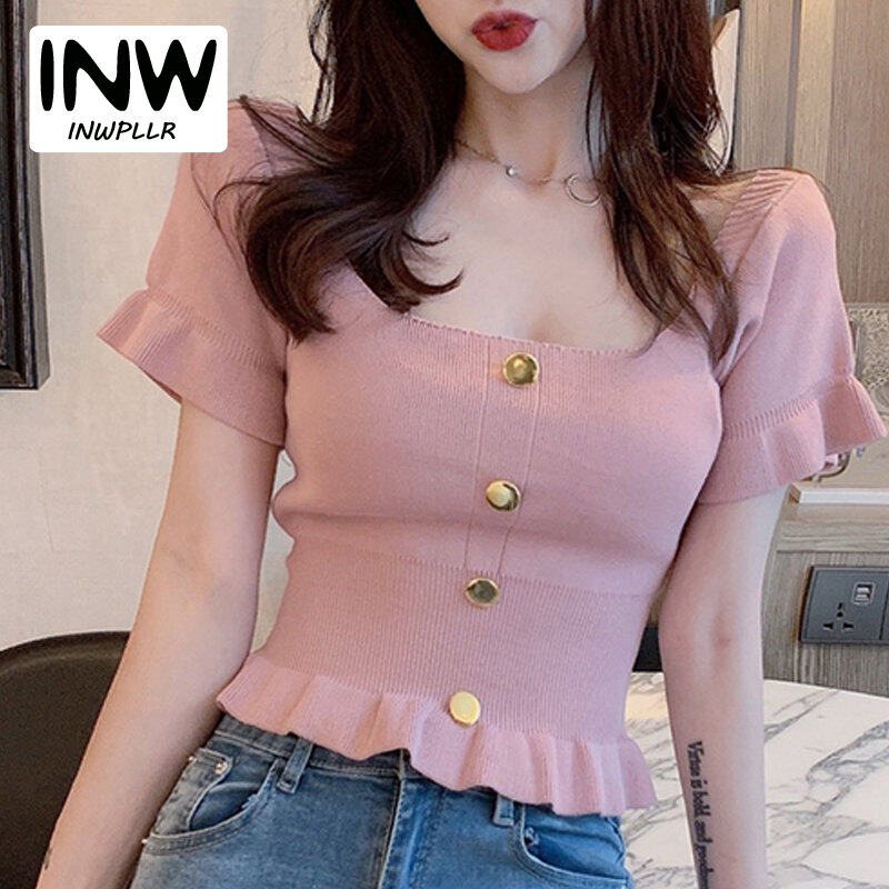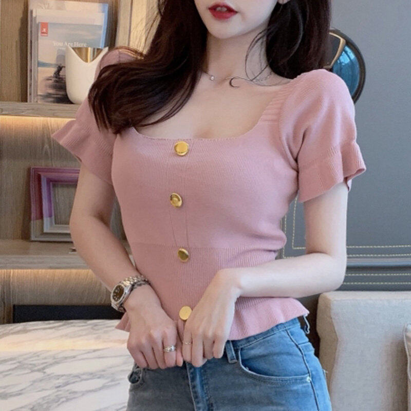 INWPLLR Women's Short Sleeve Tshirt Summer Ethnic Women T-shirt Korean Elegant Knitted Top Fashion Buttons Tshirts Minimalist Wear Women T-shirts Pink 2020