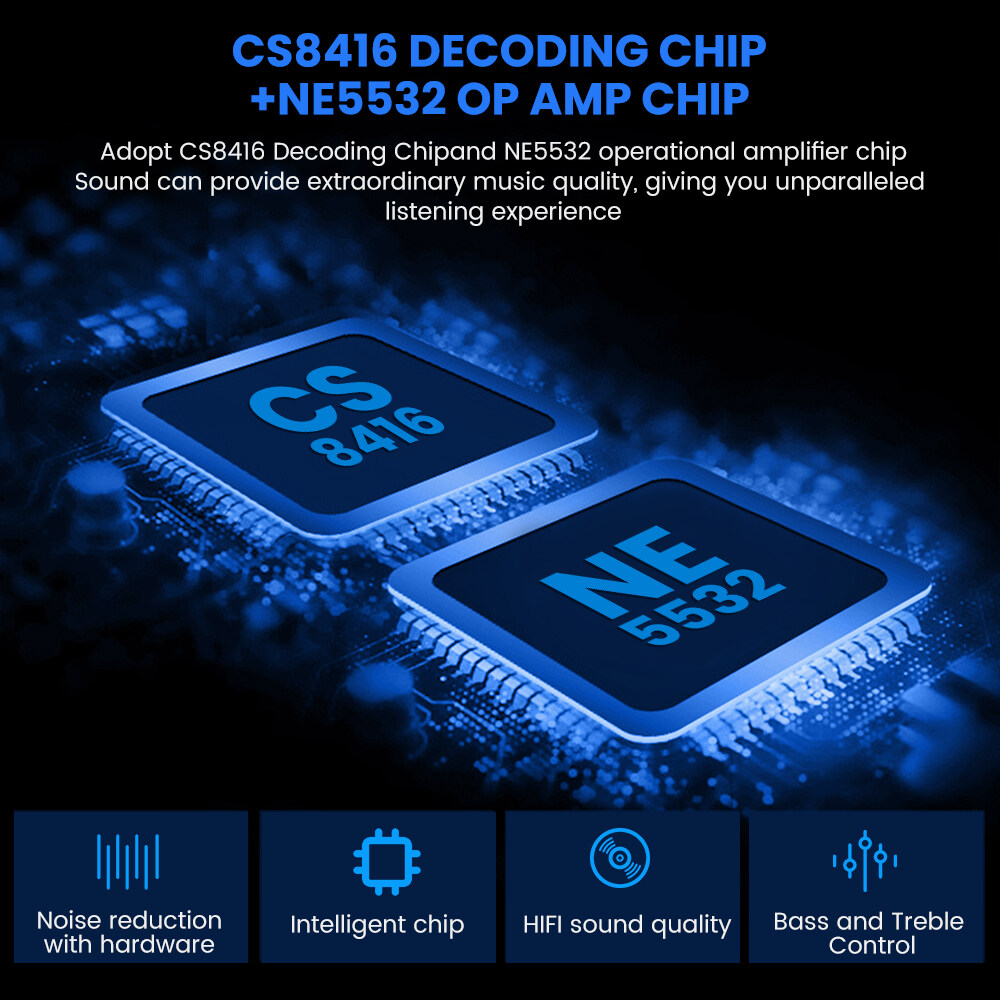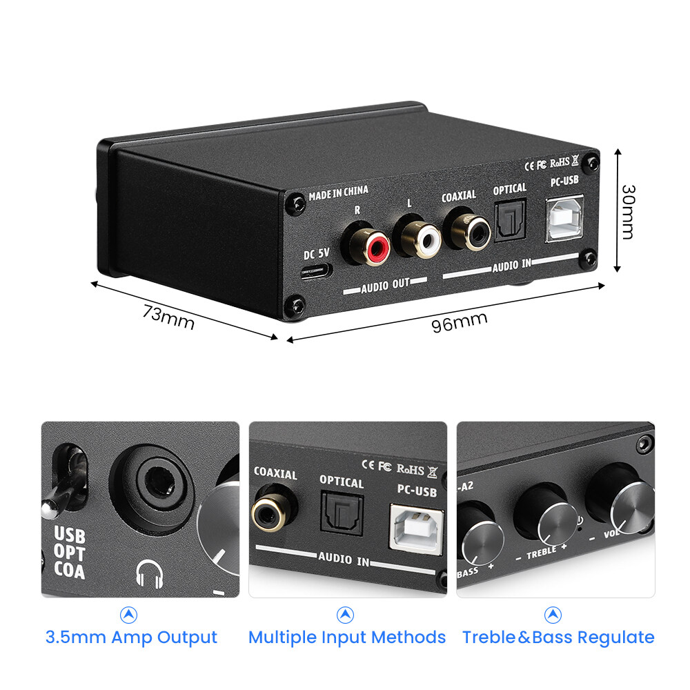 1.With USB, optical and coaxial S/PDIF inputs can fit with most home audio system, and RCA output can be connected to amplifier or powered speakers on your desktop; Built-in Hi-Fi headphone amp chip can drive most 16ohm to 200ohm headphones