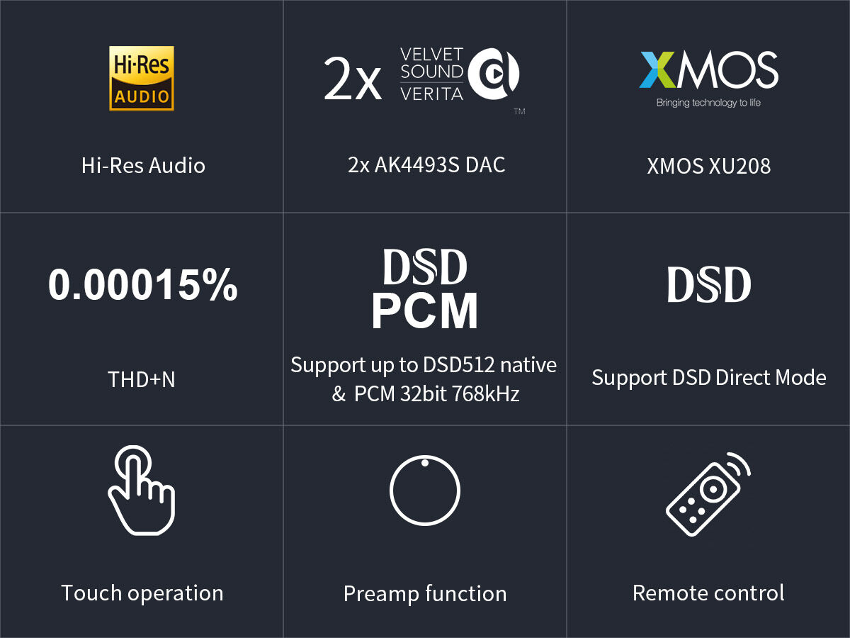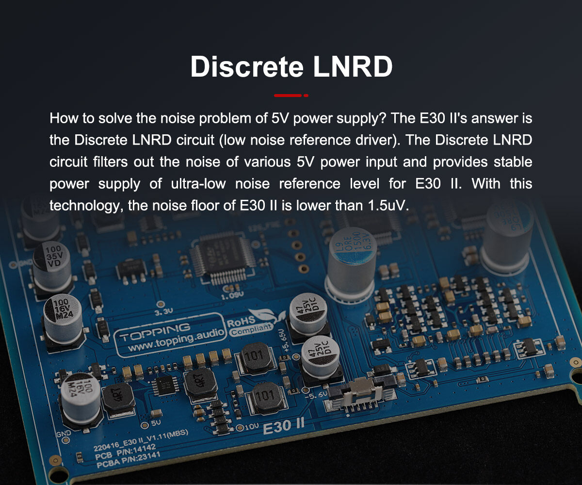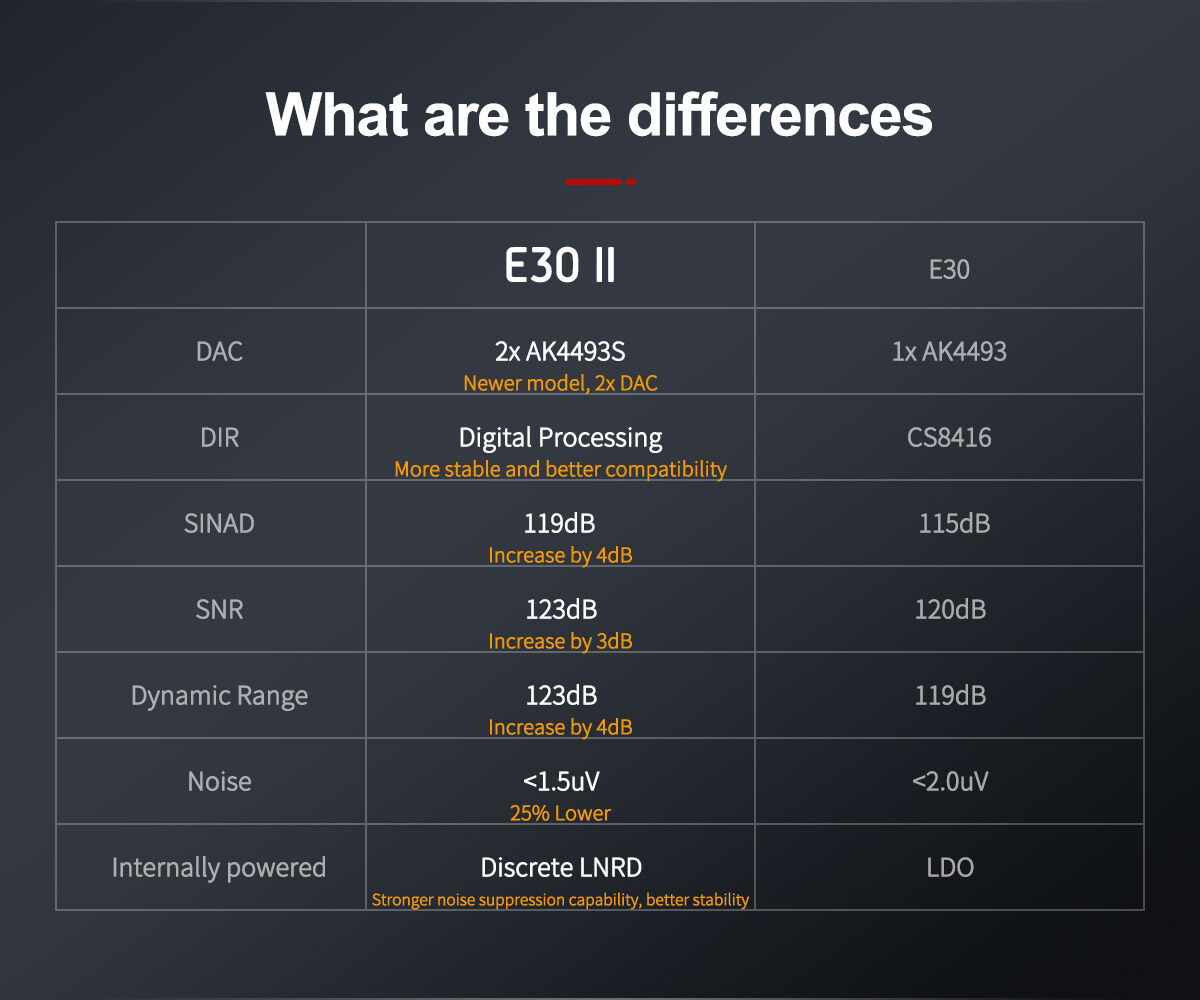 E30II Spec:PCMUSB :44.1kHz-768kHz 16bit-32bitOPT/COAX : 44.1kHz-192kHz 16bit- 24bitDSD (Native) USB :DSD64-DSD512 OPT/COAX :Not supportedDSD (DoP)USB : DSD64-DSD256OPT/COAX :Not supportedOutput Voltage:2.1Vrms@0dBFSNoise:<1.5uVrms @A-weightingCrosstalk:-132dB @1 kHzSNR:>121dB @ 1kHzDynamic Range:123dB @1kHzChannel Balance:<0.3 dB