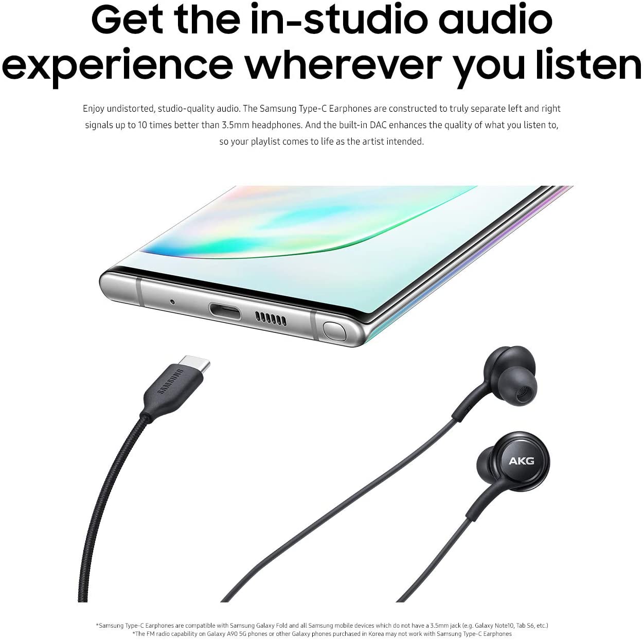 Product Overview:Enjoy undistorted, studio-quality audio. The Samsung Type-C Earphones are constructed to truly separate left and right signals up to 10 times better than 3. 5mm headphones. And the built-in DAC enhances the quality of what you listen to, so your playlist comes to life as the artist intended. Made with 2-way speakers, the Samsung Type-C Earphones offer rich audio that comes through clear and balanced. The technology is tuned by AKG, so you get pro-grade sound quality. Crafted with lightweight materials, each earbud is designed to sit comfortably in your ears so you can tune out the world with your music — just choose from the included eartip options to get the right fit. And the fabric cable prevents the earphones from getting tangled up in your bag or pocket.