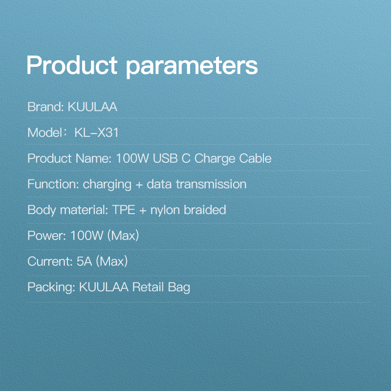 KUULAA USB Type C to USB C PD 100W Cable Samsung Note 10 Galaxy S9 S10 S20 Xiaomi Quick Charge 4.0 PD 100W Fast Charger 480Mbps Cable for MacBook PD fast charge up to 100W 20V/5A (max), 15V/3A, 12V/3A, 9V/3A, 5V/3A with USB-C Power Delivery adapters such as PD 18W / 30W / 45W / 60W / 61W / 87W / 96W